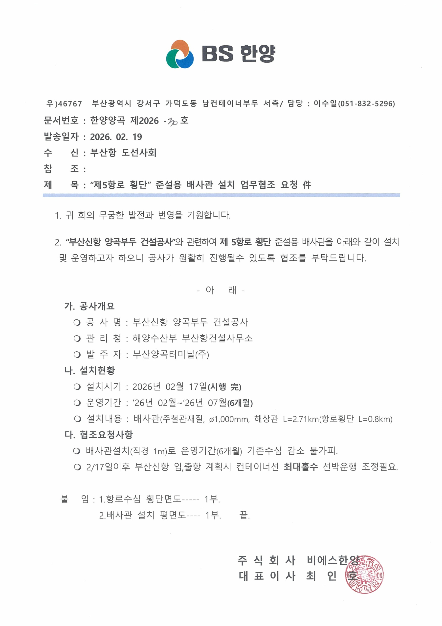 표제의 건 관련하여 26년 7월까지 하기와 같이 부산신항 제5항로 횡단 준설용 배사관이 설치됨을 알려드리며,